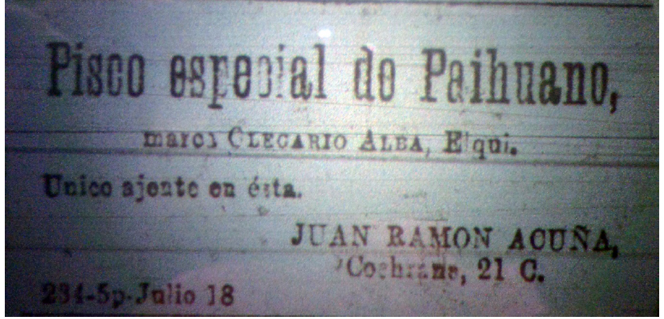 Aquí aparece el primer registro de una marca de pisco chileno, perteneciente a Olegario Alba de Elqui, en la cuarta región. Alba es considerado el pionero en la industria pisquera chilena.