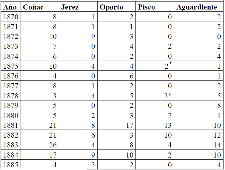 Como es posible apreciar en el cuadro 2, hubo un aumento en el avisaje del Pisco, en pleno desarrollo de la confrontación con Perú y Bolivia. Si bien un enfrentamiento no trae nada bueno para ninguno de los involucrados. El pisco obtuvo un fuerte reconocimiento en la publicidad de la época, gracias al aumento en la importación de pisco peruano, de hecho aparece mencionada la primera marca chilena, aunque muy en menor medida comparado al coñac, que dominó ampliamente el avisaje publicitario en estos quince años. La situación no varía, en cuanto a la disparidad en periódicos más pequeños del país, salvo el caso particular de "El Coquimbo", en este caso el dominio del pisco es considerable, ya que se trata del principal producto de la región. Desde 1879 a 1885, se contabilizó un total de 18 avisos concernientes al pisco, contra 1 de coñac, 2 de oporto, 2 de jerez y 1 de aguardiente.