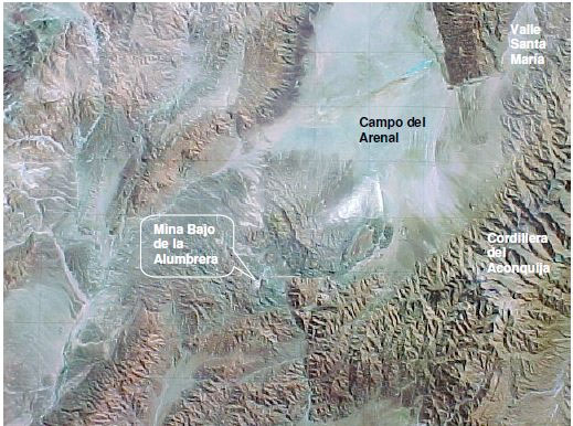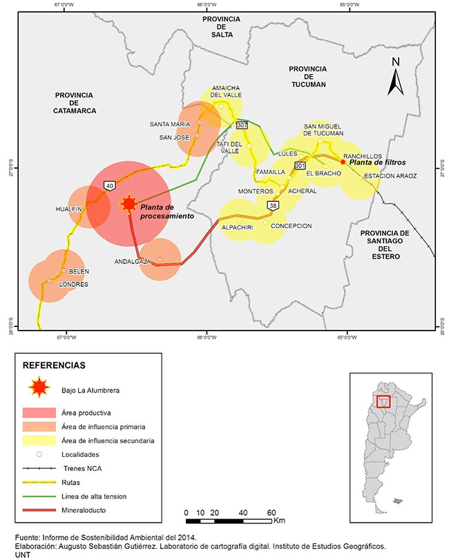 En Argentina, el caso “testigo” es el emprendimiento megaminero de oro y cobre conocido como Mina Bajo La Alumbrera ubicado, en la Provincia de Catamarca (en el noroeste del país). Este comenzó su etapa de construcción en 1994 y su puesta operativa data de 1997. Se encuentra al este de la cordillera de los Andes y a una altitud de 2.600 msnm; la Ruta Nacional N° 40 posibilita el acceso a la mina y une las localidades de Los Nacimientos y Santa María (Catamarca) con Tucumán, a través de la localidad de Amaicha del Valle, ubicada a unos 20 kilómetros de Santa María y a 300 kilómetros del yacimiento minero. El emprendimiento es explotado por una Unión Transitoria de Empresas (UTE) entre Yacimientos Mineros Aguas de Dionisio (YMAD) y Minera Alumbrera. La composición accionaria de Minera Alumbrera Ltd. pertenece en la actualidad a un conjunto de aglomerados accionarios compuesto en un 50% por las recientemente fusionadas Glencore-Xstrata, el 37,5% a Goldcorp Inc. y un 12,5 % a Yamana Gold (Informe de Sostenibilidad Ambiental Minera Alumbrera, 2014).