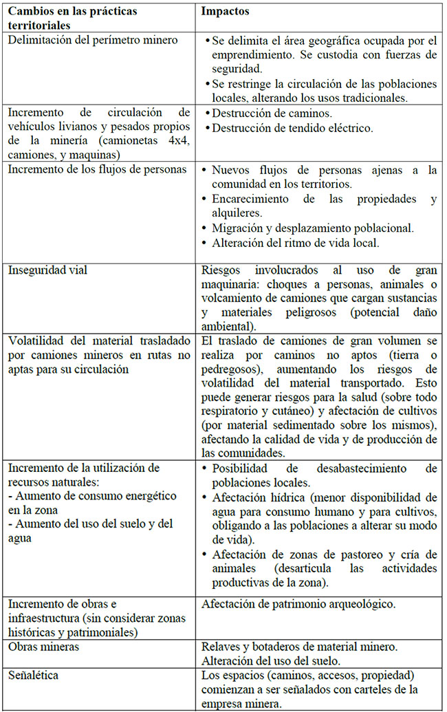 La construcción del emprendimiento implicó una serie de reconfiguraciones territoriales que se fueron profundizando con el correr de los años. A continuación, presentamos un cuadro que resume los principales cambios introducidos a nivel territorial y sus principales impactos.