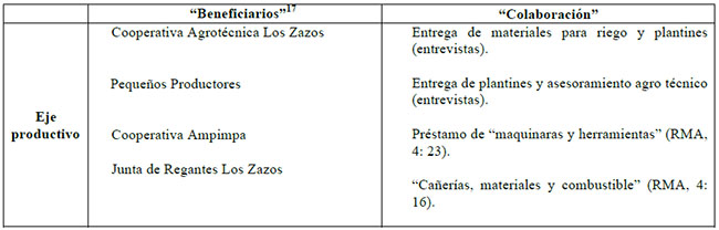 Una vez definidos de alguna u otra manera los términos de esa reciprocidad, la empresa procede a llevar adelante sus programas. En el marco de esta relación empresa-comunidad que supone la idea de cierta “confianza” y contraprestación por parte de las comunidades por la “contribución” recibida, la empresa lleva adelante un conjunto de iniciativas de RSE en la comunidad de Amaicha del Valle. Entre ellas pueden distinguirse las productivas, las culturales, las de educación, las deportivas y las sociales. Entendemos que todas estas iniciativas de intervención empresaria producen consecuencias en el plano territorial. Sin embargo, para el presente trabajo nos interesa indagar especialmente en aquellas políticas orientadas a la producción que afectan particularmente los mundos rurales. En el siguiente cuadro presentamos un esquema de las distintas iniciativas orientadas a la producción que encontramos en la localidad.