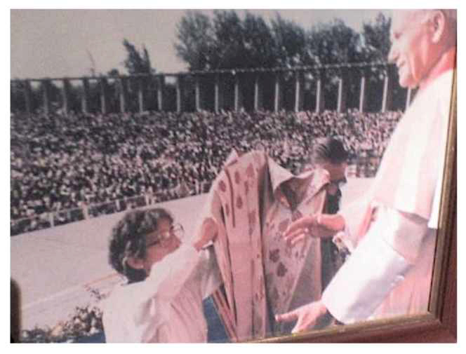Figura 9. Julia Peralta sosteniendo la casulla y estola regaladas a Juan Pablo II con ocasión de su visita a Chile