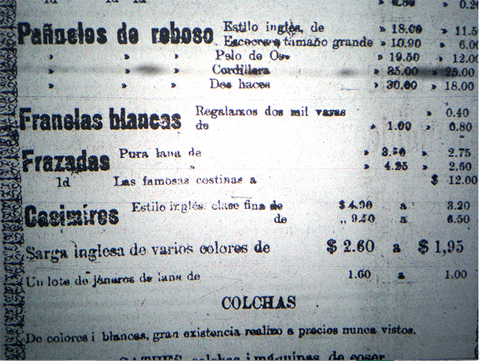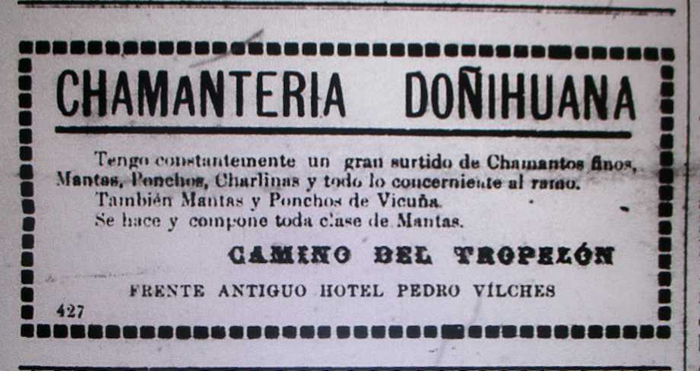 Para la época en que comienza la primera etapa marcada de comercialización del chamanto (el primer aviso registrado de venta corresponde al 1° de julio de 1917 en Rancagua) la casa de Pedro A. Montenegro ofrece en portada, en el periódico El Liberal (San Fernando) con fecha 7 de julio de 1912 (y durante todo ese mes) venta con 50% de descuento de un surtido de mercadería comprados a los distribuidores/importadores instalados en el puerto de Valparaíso “Casa Tapia” (Figura 2). Entre dichas mercaderías se ofrecen en venta elementos importados como pañuelos de rebozo y casimires ingleses. Como hemos visto, estos elementos podían ser adquiridos localmente por miembros de la élite para luego ser utilizados en su deshilado para la confección de un chamanto.