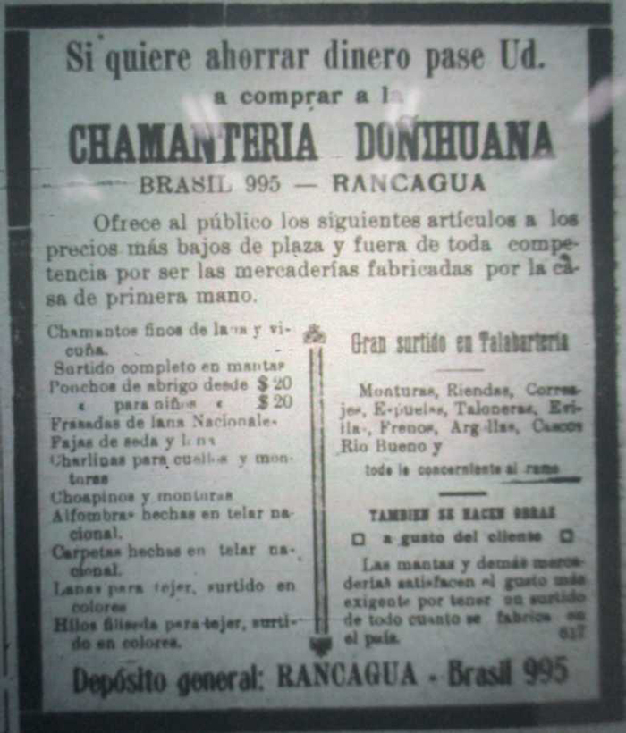 Buena parte de estas valorizaciones se debe al esfuerzo de dos tejedoras doñihuanas con gran visión comercial. El primer gran impulso comercial lo realizó doña Ana Rosa Acevedo, propietaria de la tienda “La Doñihuana” que inicia actividades en 1911 (Guajardo y Gruzmacher, 1998) y comienza a publicitar sus productos desde el 1 de julio de 1917 (en La Semana de Rancagua, Figura 3). Ella tuvo la capacidad de poner en circuito estas prendas. Doña Ana Rosa, originaria de Doñihue, a través de sus contactos con vecinas tejedoras de su pueblo natal, inició la comercialización del chamanto doñihuano. Don Francisco Martínez de Pablo, su marido y antiguo mayordomo de la hacienda de Aculeo, recorría las distintas ciudades del país vendiendo dichos chamantos y aperos de huaso que él mismo fabricaba, y también de otros artesanos. De esta manera “La Doñihuana” fue una tienda pionera y reconocida por vender productos típicos, entre los cuales el chamanto de Doñihue tuvo una figuración especial. En su publicidad, destacan los logos que tempranamente adquieren, así como los productos ofrecidos entre los que descolla el chamanto, fino, de labor, de una o doble faz. En un artículo publicado por Chile Nuevo (Rancagua, 19 de abril de 1925) en que se recorren las industrias locales, se destaca a “La Doñihuana”, calificado como un negocio de “primera clase”, con gran calidad y variedad de mercadería, detalles que realzan las prendas como “originales”, todo lo cual ponía a este emprendimiento “a la cabeza de los establecimientos similares de todo el País”. En esa época, llama la atención entre los artículos ofrecidos unos “finos de alta novedad [...] chamantos de lana, muy hermosos desde $200” (Figura 4). Se insiste además, desde los primeros avisos comerciales, en la hechura a “gusto del cliente” (Figura 5). Todos los conceptos vertidos por este artículo en torno a “La Doñihuana” aluden a la consolidación de un textil de prestigio, pensado para la élite.