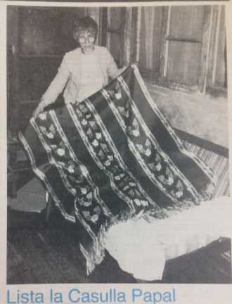 Del poder económico, al poder político, solo falta un poder que conquistar en el posicionamiento del chamanto como producto de élite: el poder religioso. El periódico El Rancagüino deja constancia de este hecho, registrando el regalo de la comunidad doñihuana de una casulla y estola (Figura 9) al papa Juan Pablo II con ocasión de su histórica visita a Chile, en el año 1987. En ésta, la única visita que el máximo pontífice ha realizado al país, se llevó un tejido realizado por las chamanteras, un chamanto adaptado a la vestimenta papal. El tejido completo, realizado por Julia Peralta (reconocida tejedora y maestra de tejedoras, actualmente retirada) fue pensado cuidadosamente: la casulla, con 3 metros de largo y 1,30 de ancho, contempló un diseño de espiga (para simbolizar el pan) y vid (la sangre de nuestro señor Jesucristo) en los colores tradicionales del Vaticano. En una segunda noticia publicada por el mismo periódico, se da cuenta del enorme trabajo realizado por doña Julia al completar su labor (El Rancagüino, Rancagua, 26 de marzo de 1987, en portada).
