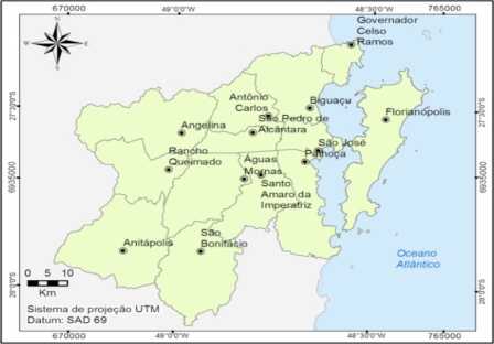 A região encontra-se dividida em 13 municípios (Mapa 1): Águas Mornas, Angelina, Anitápolis, Antônio Carlos, Biguaçu, Florianópolis, Governador Celso Ramos, Palhoça, Rancho Queimado, Santo Amaro da Imperatriz, São Bonifácio, São José e São Pedro de Alcântara; possui uma superficie de 7.465 km2, e reúne uma população estimada em 1.012.831 pessoas (Santa Catarina, 2015).