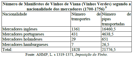 Certo é que, anteriormente a 1678, uma parte dos vinhos de qualidade que se produziam nas terras do norte de Portugal deixavam o país pelo porto de Viana do Castelo que, pelo menos até 1730, teve a sua barra desimpedida, funcionando assim como porta de saída dos Vinhos Verdes para os mercados da Europa do norte, tocados por mercadores ingleses que se fixaram na cidade da foz do Rio Lima (Sellers, 1899: 19). Só vencida a década de vinte do século XVIII, os vinhos do Douro ganharam claramente a dianteira das exportações portuguesas de vinhos (Cardoso, 2003: 281).