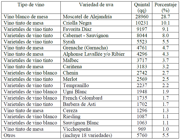 En los valles de Tarija se cultivan diferentes variedades de vid, de las cuales 7 representan más del 70% de la producción de uva en Bolivia. Éstas 7 variedades, a excepción de la Moscatel de Alejandría que representa el 29% de la producción total, son destinadas para elaboración de vino tinto, como se aprecia en el cuadro N° 1:
