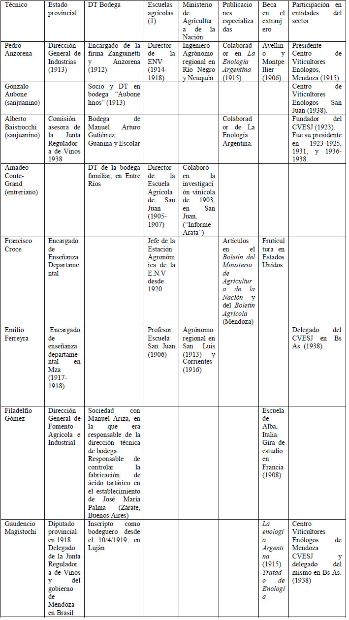 En menor medida, algunos enólogos se desempeñaron como asesores técnicos del Ministerio de Agricultura de la Nación, no solo en Mendoza sino también en otras provincias donde se buscaba impulsar diversas actividades de base agrícola, irrumpiendo, de este modo, en espacios que prioritariamente habían sido ocupados por ingenieros agrónomos de las universidades de La Plata y de Buenos Aires. Por último, destacamos su participación como agentes de divulgación a través de la colaboración y edición de revistas especializadas -algunas de las cuales alcanzaron difusión nacional- y de manuales y folletos técnicos sobre cuestiones vitivinícolas.