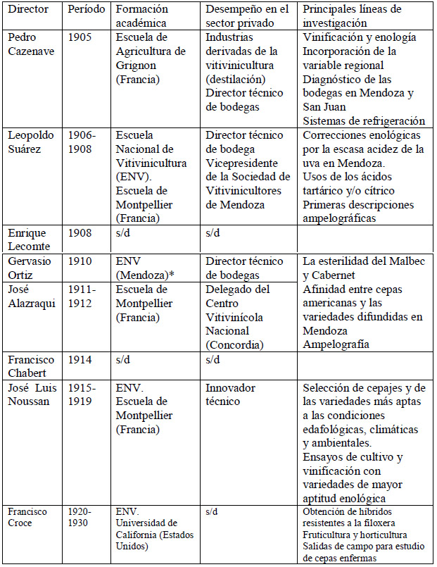 Cuadro 2: Directores de la Estación Agronómica de Mendoza (1905-1930) señalando formación académica, inserción laboral y líneas de investigación impulsadas.