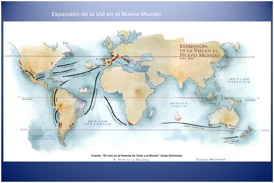Figura 1 : Expansión de la vid en el nuevo mundo. A Chile es introducida en 1548, a través del puerto de Talcahuano, por el fraile Francisco de Carabantes