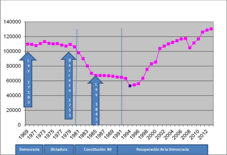 Entre 1940 a 1974, las diversas legislaciones vitivinícolas chilenas prohibieron la plantación y los trasplantes de viñas, manteniéndose la superficie en una cifra en torno a las 107.000 hectáreas. Estas disposiciones legales fueron derogadas en 1974, acorde a la imposición de una concepción muy liberal en la economía que fue asumida por la dictadura militar (1973-1990). Hacia 1982 y 1983, estos hechos derivaron en aumentos sustanciales de la producción, la cual coincidió con una importante reducción en el consumo interno, provocando una drástica caída del precio interno de la uva y una de las crisis más severas que ha afectado al sector vitivinícola chileno (Hernández y Pszczólkowski, 1986). A consecuencia de lo anterior, se produjo una violenta caída de la superficie de viñas, llegando esta a sólo 53.093 hectáreas en 1994 (SAG, 1996), tal como se observa en la Figura 2.
