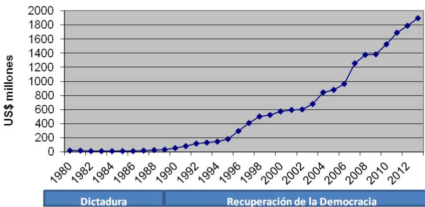 Frente a esta crisis y adaptándose a las políticas de liberalización de las normativas legales, como así también a la apertura económica impuestas al país durante la dictadura, el sector vitivinícola se modificó sustancialmente en cuanto a la propiedad de las empresas, desapareciendo como propietarias de grandes viñas las familias tradicionales (hasta hoy sólo se mantiene la familia Cousiño, como propietaria de Viña Macul) siendo reemplazadas por grupos económicos o sociedades anónimas, incluso con participación internacional. Esta situación derivó en una notable inversión en infraestructuras productivas y dio un impulso definitivo hacia la modernización del negocio vitícola. Es así que partir de 1990, Chile se focalizó en la exportación de vinos, ampliando inconmensurablemente el mercado, donde hoy los vinos chilenos se exportan a más de 100 países en los cinco continentes y el monto en dólares alcanza los 1.900 millones en 2013 (Figura 3), proyectando el plan estratégico de la industria un monto de 3.000 millones para 2020.