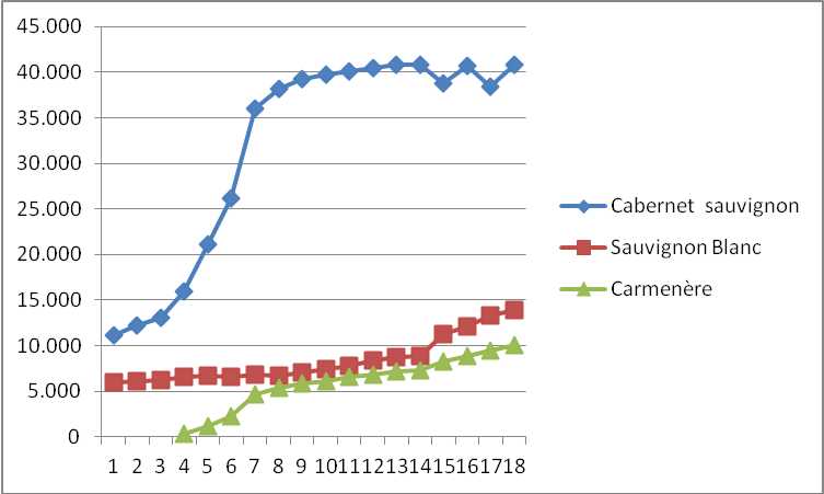 Cabernet-Sauvignon, cultivado preferentemente en la depresión central de Chile, desde el valle del Maipo hasta el Maule, representaba casi el 12% de la superficie (12.579 ha) en 1978 (Cuadro 1). La superficie en 1994 es levemente inferior (11.112 ha), pero dada la brusca caída de la superficie total de viñedos, su participación porcentual resulta mayor, alcanzando un 20,9%. A partir de esa fecha se observa un significativo incremento, alcanzando en 1997 una superficie de 15.995 ha (25,2%), con lo que Cabernet-Sauvignon sobrepasa por primera vez la superficie de País (15.241 ha) y se transforma en la variedad más importante del viñedo chileno, tendencia que continúa hasta 2001 donde alcanza las 38.227 ha, con un 35,7% de la superficie de vides destinadas a vinificación, para luego enlentecer significativamente su incremento (Figura 4), llegando algo más de una década después, en 2013, a 42.195 ha., con lo cual su participación disminuye a un 32,4% del total de la superficie de vides destinadas a vinificación.