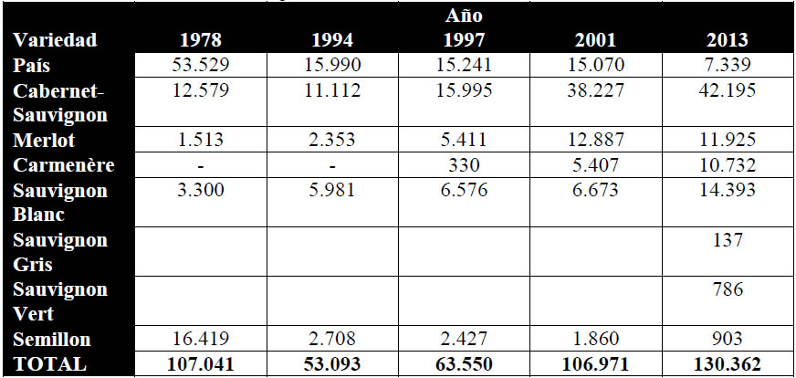 En el Cuadro 1 se presenta la evolución de la superficie total en hectáreas para el viñedo chileno y para algunas variedades en particular, como País, Cabernet-Sauvignon, Merlot, Carmenère, Sauvignon Blanc, Sauvignon Gris, Sauvignon Vert y Semillon, en años de relevancia significativa, tales como 1978, 1994, 2001 y 2013.
