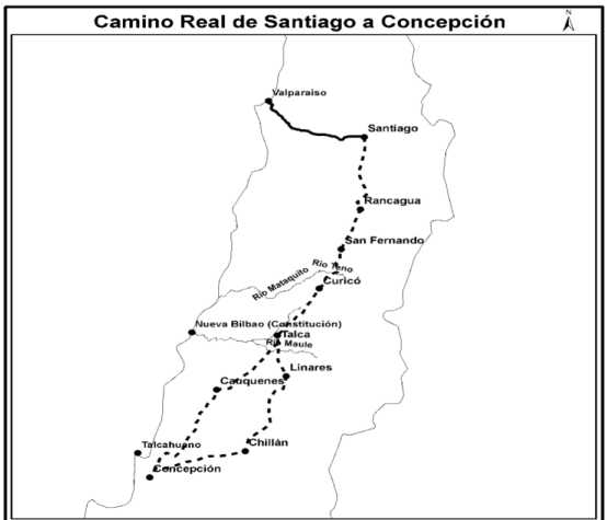 Así como la ruta de Valparaíso aseguraba la conexión del puerto con la Capital, el vínculo de Santiago con los pueblos y haciendas del Valle Central se cultivó mediante el Camino Real a Concepción. Esta fue la principal vía terrestre de norte a sur en Chile durante el período colonial, pues permitía enlazar sus dos ciudades mayores. Con una longitud de 100 leguas, por esta vía circularon durante tres siglos gobernadores y obispos, mercaderes y comerciantes, viajeros y religiosos. Tuvo también importancia estratégica en funciones de seguridad y defensa, sobre todo para el desplazamiento de tropas al ejército permanente con asiento en la frontera del Biobío. Por el camino real circulaban noticias, cartas, cédulas y documentos oficiales, así como el real situado, alimentos, ganado y productos que avivaban el naciente comercio del Reino de Chile. Este camino representaba su columna vertebral, a lo largo del cual nacieron numerosas ciudades que, en la actualidad, constituyen capitales regionales y provinciales.