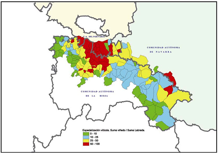 Figura 1: Mapa de términos municipales que integran el espacio de producción de la DOCa Rioja, según relación superficie de viñedo/superficie cultivada (2007)