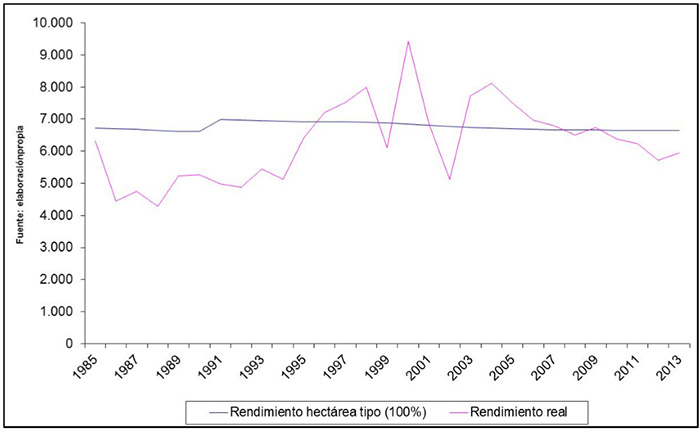 En definitiva, la evolución del rendimiento por hectárea es el resultado de un conjunto de cambios que, con carácter general, explican el aumento del mismo y entre los que sólo el cambio varietal, por la reducción de la superficie cultivada con variedades blancas, actúa en sentido contrario. La consecuencia de esta evolución en la estructura productiva del sector, en la que se producen cambios que actúan en diferentes direcciones respecto del rendimiento, no es otra que el aumento del rendimiento medio real obtenido17 que, si hasta 1995 no alcanzaba ningún año el rendimiento medio tipo, desde el año 1996 lo supera frecuentemente (Figura 2) lo que llevó al sector a adoptar acuerdos para su contención a partir del año 2007.