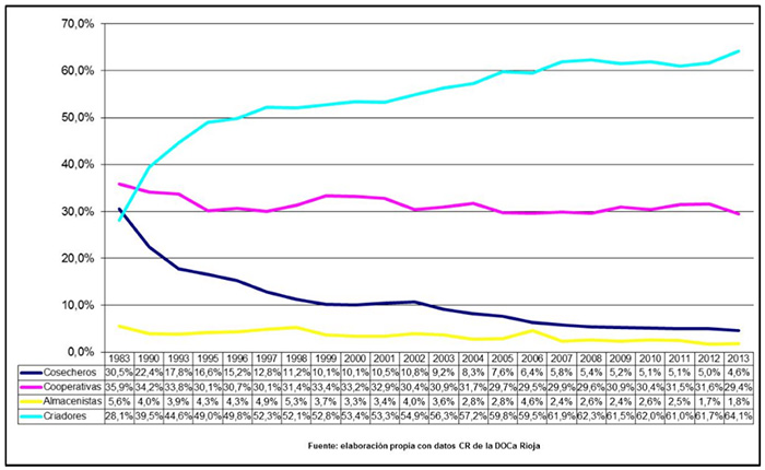 Hay que destacar la pérdida de importancia relativa de una figura histórica en el sector, los cosecheros. El cosechero, como elaborador y vendedor de vino joven, mayoritariamente a granel, ha ido desapareciendo al mismo tiempo que emerge con fuerza la figura del cosechero criador, esto es, el viejo cosechero protagonista en los siglos anteriores de la historia del Rioja entra, en el siglo XXI, como una bodega, generalmente de tipo familiar, que elabora su producción de uva, y que vende vino embotellado, joven o criado. La situación económica del sector en las últimas décadas ha facilitado este cambio (Barco, 2008a).