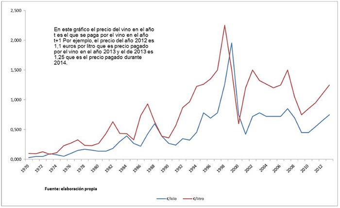 Figura 5: Precios pagados por la uva y por el vino en la DOCa Rioja (1970-2013)