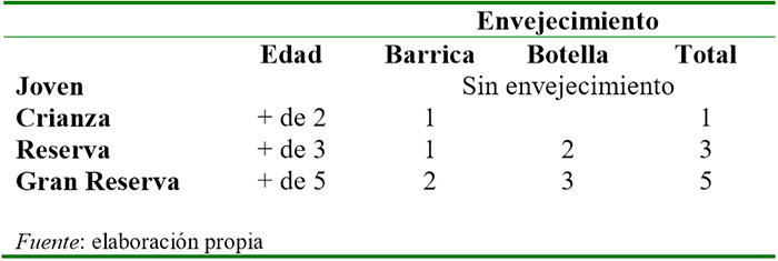 Por lo que respecta al color, cada vez es un indicador menos relevante, debido a la pérdida de importancia de la producción de uvas blancas y a una menor elaboración de vinos blancos y rosados, en favor de los vinos tintos, que concentran la mayor parte de la producción. Si en los primeros años de la década de los ochenta el vino blanco y rosado representaba más de la cuarta parte de la elaboración y ventas de Rioja, en el año 2013, los vinos tintos representan el 90 por ciento y los blancos el 5 por ciento. A diferencia de lo que ocurre en otras zonas productoras, el criterio que tradicionalmente, al menos desde el siglo XIX, ha segmentado la oferta y la demanda en el sector vitivinícola riojano, tiene que ver con el tiempo de envejecimiento20 regulado en el capítulo IV del Reglamento de la Denominación. Este proceso permite poner en el mercado cada año, además del vino joven o sin crianza, tres tipos diferentes de vinos envejecidos: vino de crianza, término utilizado para vinos de, al menos, tres años, que han permanecido un año como mínimo en barrica; vino de reserva, que requiere un envejecimiento mínimo en barrica de roble de un año y en botella de dos; y vino de gran reserva, que corresponde a vinos de alta calidad, que han envejecido un mínimo de dos años en barrica de roble y tres en botella21 (tabla 2).