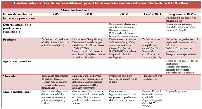 El marco institucional recoge las reglas de juego sin las cuales no es posible entender el funcionamiento económico del sector. Condiciona la definición del producto, su presentación ante los consumidores, las prácticas de cultivo y elaboración, impone barreras de entrada, condiciones de acceso a los mercados y limitaciones a la capacidad competitiva de las empresas. En este sector, las disposiciones institucionales son especialmente prolijas y abarcan tanto los acuerdos supranacionales como las regulaciones territoriales y pactos entre agentes económicos locales. En el caso de la DOCa Rioja este entramado complejo que condiciona las actuaciones del sector, puede ser sintetizado, siguiendo un criterio que va de lo más internacional a lo más local.