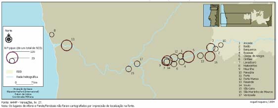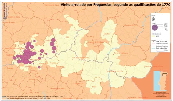 Fonte: Arquivo da Real Companhia Velha, "Livros de Arrolamento de Vinhos de Embarque", 1770. Carta Administrativa Oficina de Portugal, escala 1:25.000, IGP, 2004.