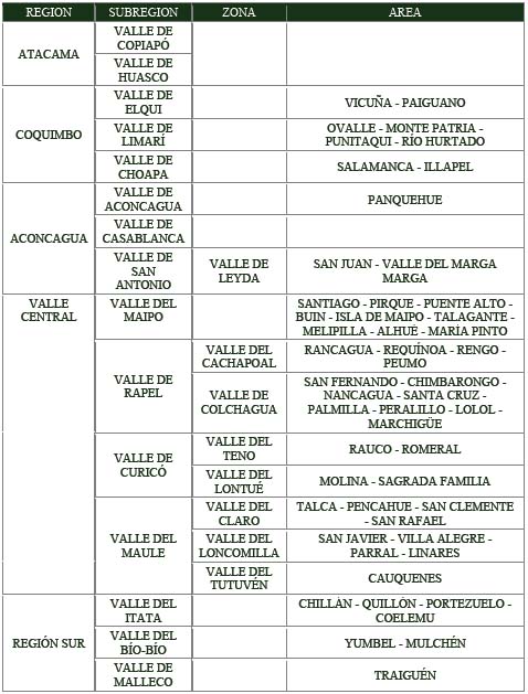 Por otra parte, el concepto más bien genérico de "Denominación de Origen" que señala el Decreto n° 464 de zonificación vitícola y Denominación de Origen de 1995, desde el artículo 1°, establece la siguiente zonificación vitícola o DO para los vinos que se produzcan en el país. Menciona además que en las etiquetas de los envases se podrán señalar las regiones, valles y/o áreas precedentemente establecidas, presentadas en el cuadro siguiente.