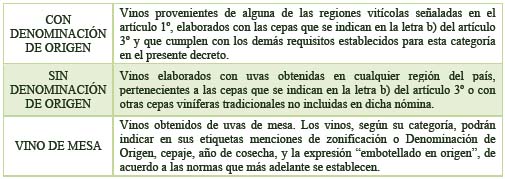 Asimismo, la ley señala en su artículo 2°: "Los vinos se clasificarán en tres categorías":