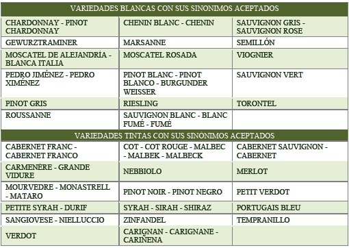 Los siguientes cepajes de uva, o sus sinónimos internacionalmente aceptados, son los únicos que pueden señalarse en la etiqueta: