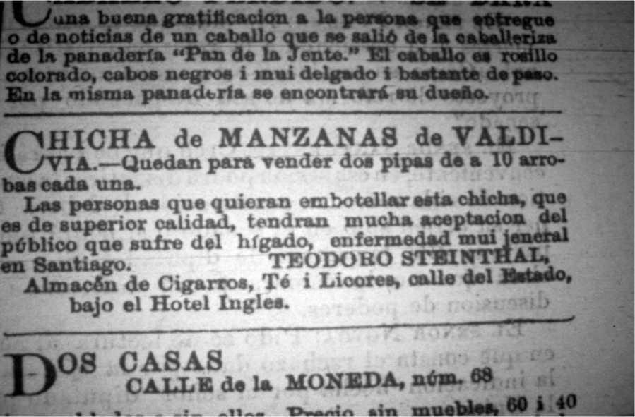 Este último punto es importante, porque el avisaje comercial parece indicar que una de las más importantes características de la chicha de manzana es su capacidad digestiva, además de ser buena para la salud. En particular, se destaca por ser colagoga (El Ferrocarril, 29 de junio de 1870, 4 de mayo de 1882, 2 de mayo de 1884). De este modo, la “chicha de manzanas de Valdivia” aparece por primera vez en el periódico El Ferrocarril el 29 de junio de 1870 (Figura 2) declarando, justamente, esas capacidades. Lo destacable es que la chicha de Valdivia es producida con manzanas de esa zona, y no de otra, lo que asegura su “superior calidad”. De hecho, posteriormente, afirma que la chicha de manzana “legítima” es la producida en Valdivia, cuestión reflejada en el avisaje como un sello de garantía de calidad (El Ferrocarril, 4 de mayo de 1882; 14 de marzo de 1877; 2 de octubre de 1870, 21 de febrero de 1875; 14 de octubre de 1908; 5 de agosto de 1910).