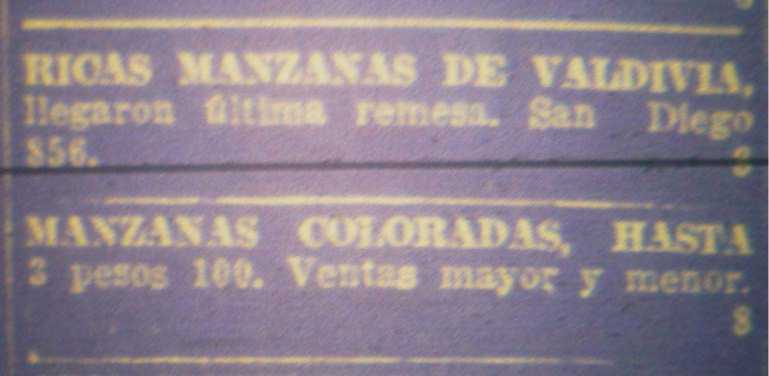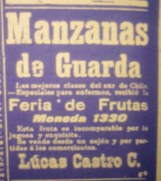 En primer lugar (Figura 1), un aviso de importante presencia en El Diario Ilustrado que clarifica tres asociaciones de importancia clave para entender el reconocimiento y delimitación, como primera cuestión, de las manzanas utilizadas para la elaboración de la chicha. Estas “manzanas de guarda”, jugosas y exquisitas (cuestión que podría dar pistas sobre la variedad o variedades de las que se trataría) se asegura son las mejores “del sur de Chile” (vincula producto con región) además de aclarar que son “especiales para enfermos”.