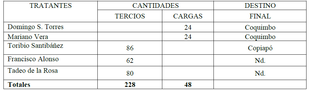 Por las cartas de correspondencia se conocen los nombres de los sujetos que solicitaron algo de yerba para surtir principalmente a las haciendas y los minerales.22 Según las cartas de orden compulsadas, Trucíos reenvió 3.970 arrobas (1766 y 1796) para dependientes en Santiago, San Felipe, Huamalemu, Valparaíso, Illapel, Copiapó, Higuerillas, Choapa Huamalata y Curimón.23