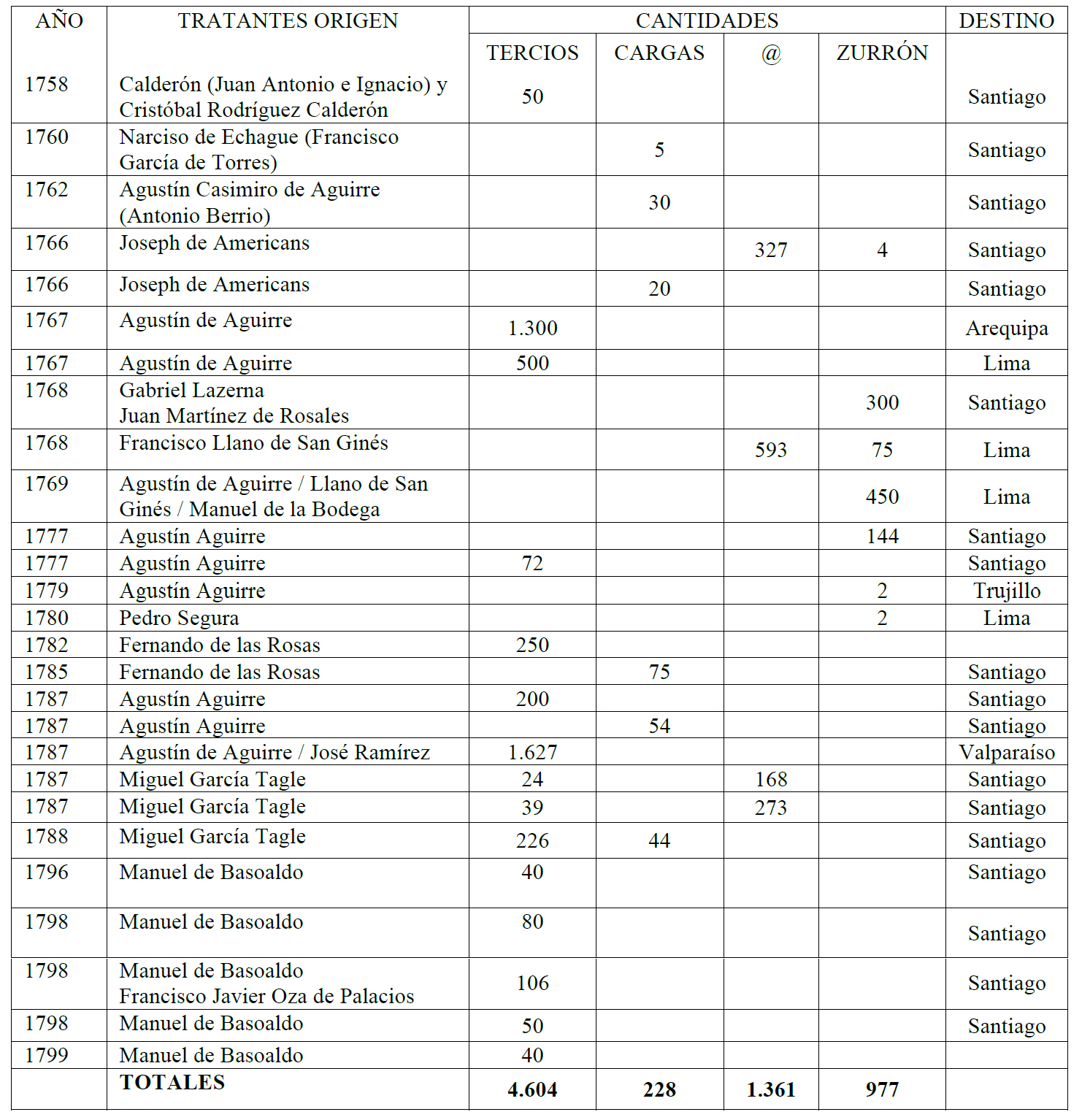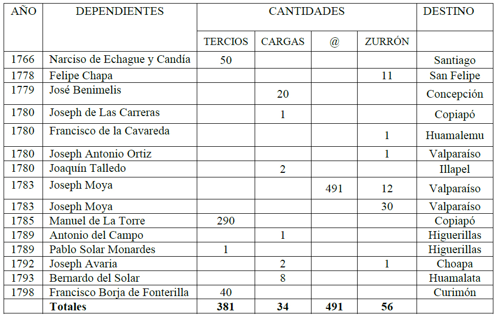 Fuente: elaboración propia a partir de datos del Archivo Histórico Nacional de Chile, Fondo Salvador Trucíos. Los datos son tomados conforme a los originales. Sin embargo, para facilitar análisis se ha procedido a las siguientes conversiones: 1 Tercio = 7@; 1 carga = 14@ = 2 Tercios; 1 zurrón = 6@.