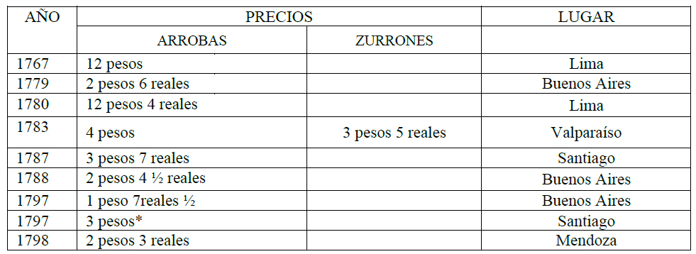 28 Años atrás, en 1737 y 1735, se había manifestado el alza en Buenos Aires a 28 reales y % la arroba, es decir, en la capital rioplatense alcanzó los 3.5 pesos.