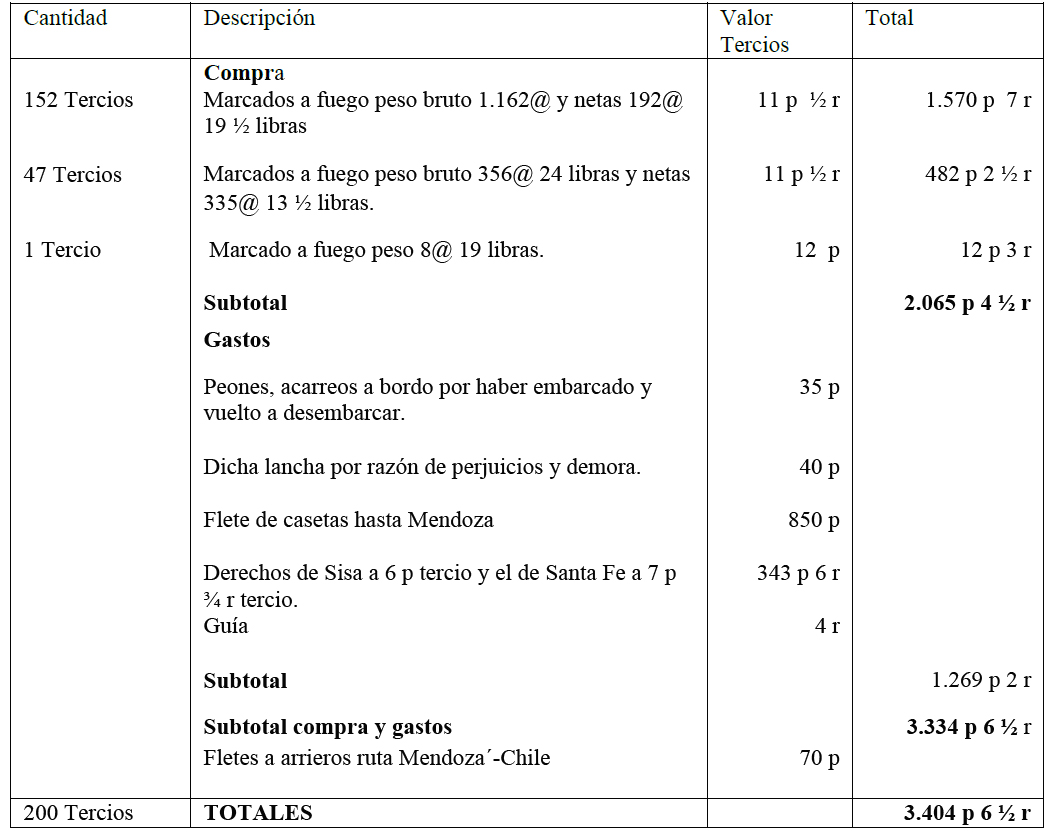 25 Entre los comerciantes figuran: Fernando de las Rosas, José de Americans (San Juan de La Frontera); Francisco Álvarez (Córdoba); Gabriel Lazerna (Santa Fe); Agustín Casimiro de Aguirre, Miguel García Tagle, Francisco Llano de San Ginés, Manuel de Basoaldo, Francisco Javier Oza de Palacios, Juan Antonio e Ignacio Calderón, Narciso de Echague (Buenos Aires); Juan Martínez de Rosales (Mendoza). Los datos originales están consignados en la Tabla N° 3. Se ha procedido a realizar la conversión con las siguientes equivalencias: 1 zurrón = 6@. Se ha modificado la carga 21@ de Ramón por 14@ que componen 2 tercios, una medida utilizada en los embarques de yerba del Paraguay (en base a De Ramón A. y Larraín J.M., 1979: 5-70).