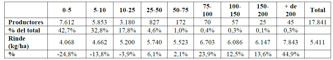 Existe una marcada relación entre escala y los rendimientos obtenidos. Los datos publicados por el INYM son contundentes, siendo el rendimiento promedio ponderado para todos los productores de 5.411 kg/ha de hoja verde. Los estratos más chicos 0-5 has obtienen rindes aproximadamente del 25% y 15% respecto del promedio, mientras que en el otro extremo, productores con superficie cultivada de entre 150-200 o más, los rendimientos superan al promedio en un 13,6% y 45% respectivamente. (Coninagro-Fedecoop, 2014: 45-46)