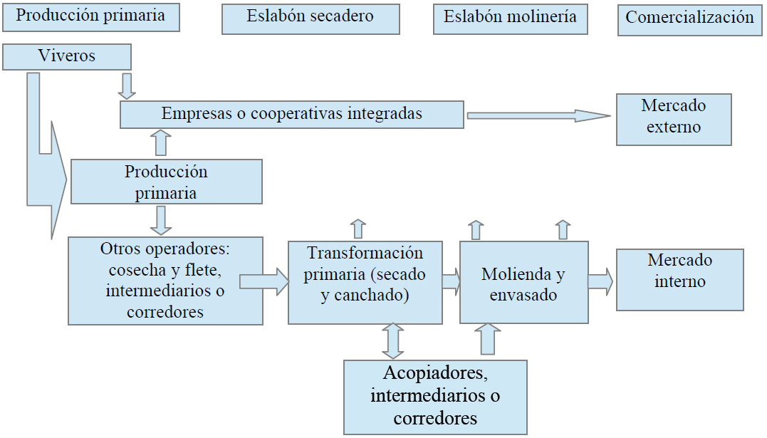 El proceso de producción se divide en dos etapas: la primera comprende la cosecha de la hoja verde hasta la obtención de yerba mate canchada3 y estacionada. En esta instancia, el objetivo principal es reducir los niveles de humedad. La segunda etapa se inicia en el molino y culmina en la elaboración del producto para su comercialización. Para que una planta pueda ser cosechada necesita un mínimo de cuatro años posterior a su implantación; no obstante, es a partir del séptimo que comienzan a tener rendimientos comerciales aceptables. Mas la cadena de la yerba mate está compuesta además por otros actores, como refleja el siguiente gráfico: