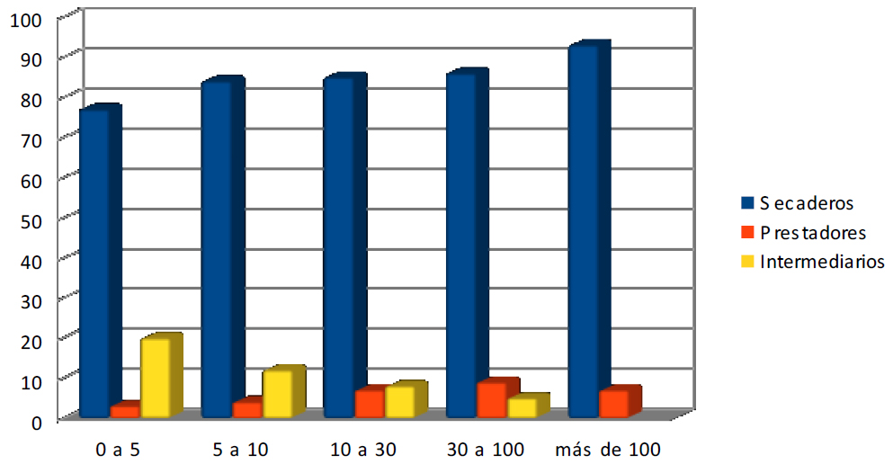 Los secaderos organizan -y en gran parte ejecutan- las cosechas de las unidades independientes que les venden el producto (Rau, 2012: 76). La importancia de los secaderos radica en que, en tanto dispositivo de coordinación económica constituye una forma intermedia entre el mercado atomizado y las firmas completamente integradas, sobre todo en la zona centro de la provincia. Se consolidan a fines de la década 1970, como consecuencia de la escasez de materia prima y asociada, también, con el debilitamiento de las cooperativas (Schiavoni, 2011: 397). Actualmente se registran más de 200 instituciones de esta categoría en la provincia de Misiones.