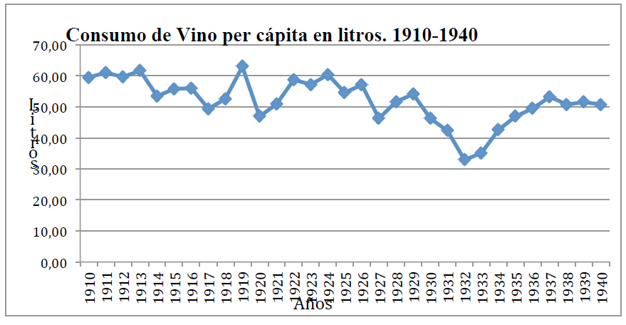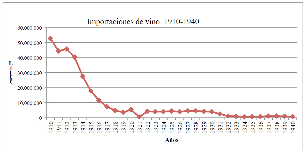 El proceso de sustitución de importaciones de vinos se logró en los años de la Primera Guerra Mundial, aunque a través de un crecimiento desordenado (Gráfico 1). La creencia de que el aumento del consumo no tendría techo, tempranamente, llevó a una industria inarmónica, masiva, mercado internista y de baja calidad, con problemas de superproducción, vaivenes de precios y acumulación de stocks y con profundos desequilibrios al interior de la cadena. Los intentos de solución al desequilibrio productivo reflejaron una puja por parte de la burguesía bodeguera, por maximizar los beneficios y por trasladar las pérdidas a los eslabones más débiles: viñateros sin bodega y trabajadores.