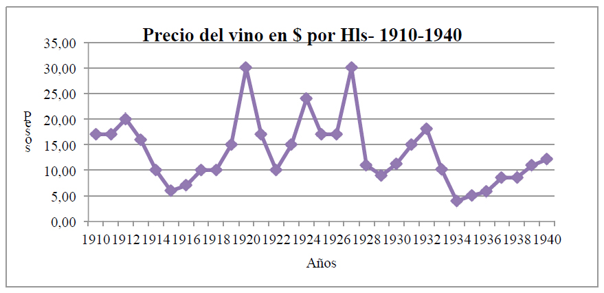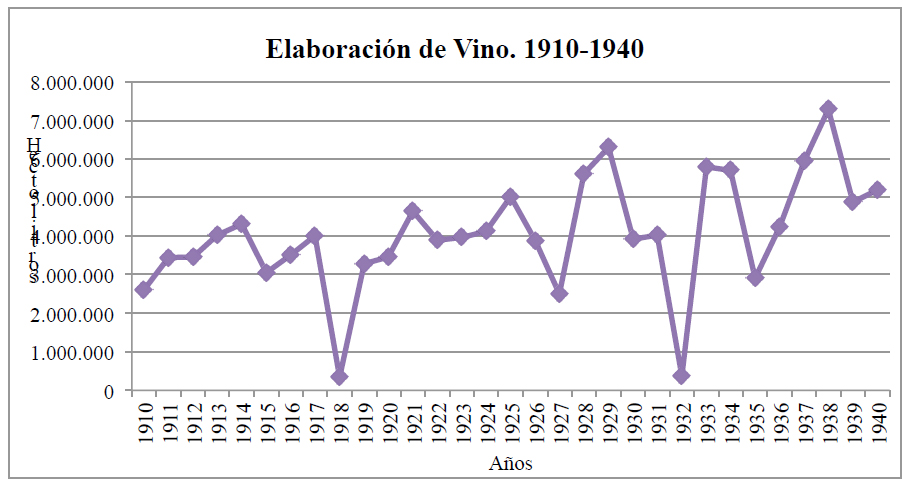 Elaboración propia en base a Vino, viñas y frutas. Año XXVIII, N° 311, julio de 1931, para los años 1910 a 1934; y Dirección de Investigaciones, Estadísticas y Censos. Cuadro N° 66, pág. 115, para los años 1935 a 1940