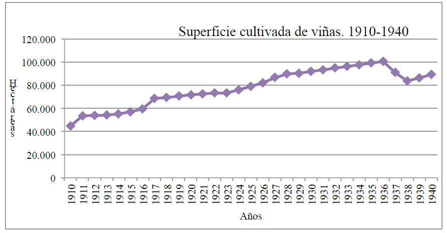 Elaboración propia en base a Centro Vitivinícola Nacional, Año XXV, N° 287, julio de 1929, para los años 1910 a 1911. Y Ana ario. Síntesis estadística}’ geográfico-económica, Mendoza, Instituto de Investigaciones Económicas y Tecnológicas, 1952: 58-59, para los años 1912 a 1940